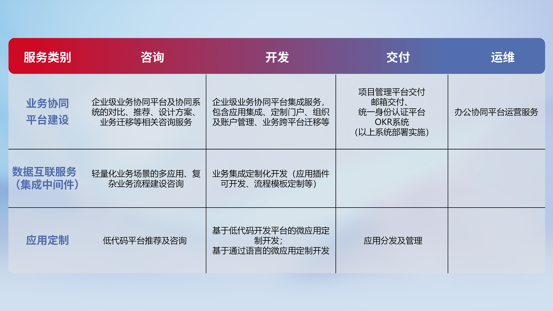 针对钉钉、、、企微、、IDaas等平台级产品提供产品的规划、、、方案、、、交付、、、定制化开发等服务,,,,实现如统一协同办公、、、、智能客户服务、、、混合会议管理、、智能数据查询、、、、等业务场景,,,实现数字化转型。。。